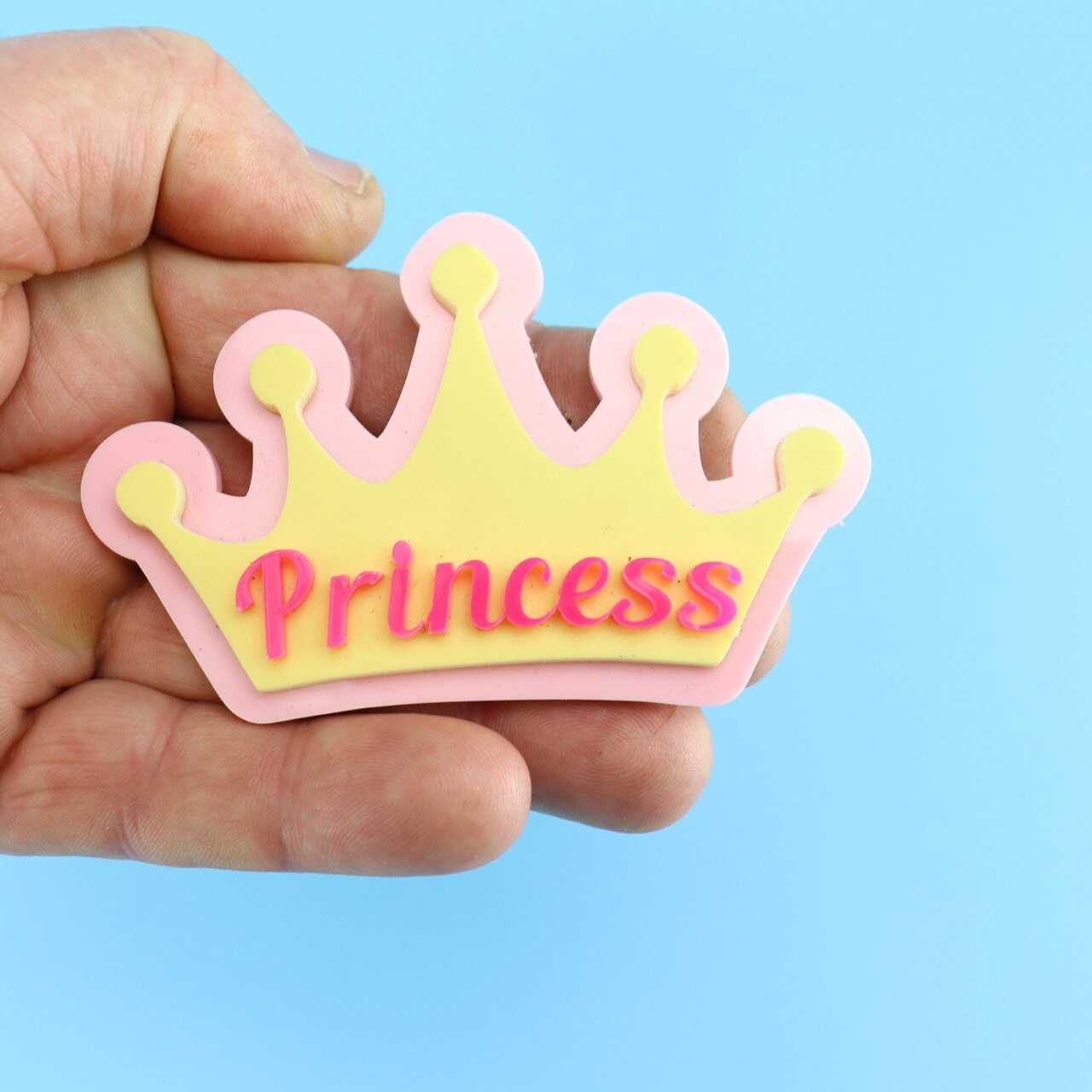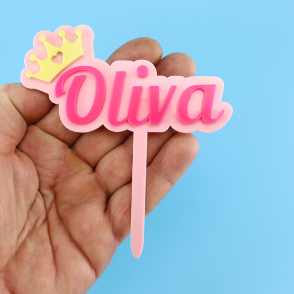 A bespoke name topper featuring your chosen name in raised acrylic lettering, finished with delicate princess crown. Designed with a cake prong for effortless placement.