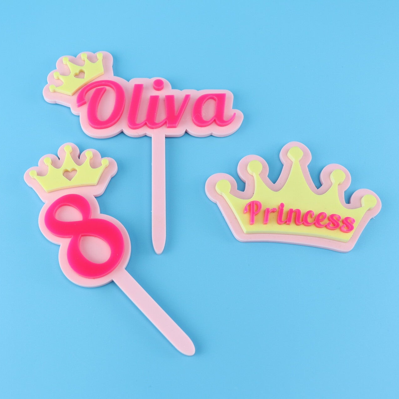 Expertly crafted from superior-quality acrylic, each piece features a luxurious double-layered construction, creating a stunning 3D effect with soft pastel tones and eye-catching raised lettering. This set is an absolute showstopper, perfect for princess-themed celebrations and magical birthday moments.