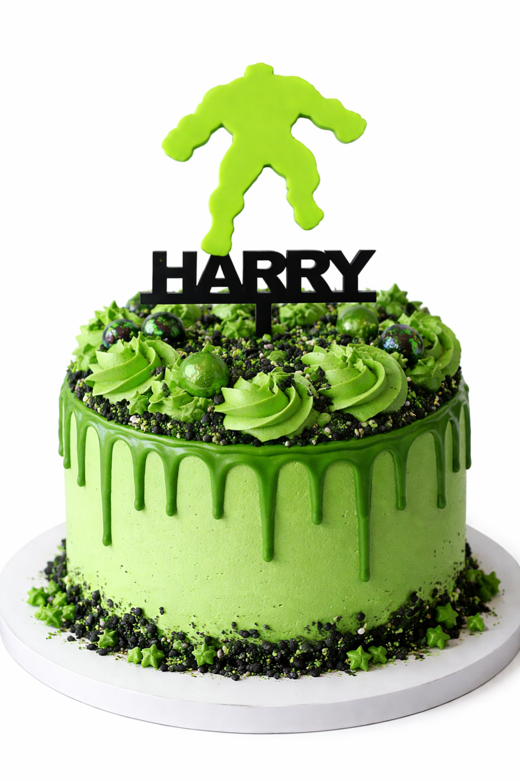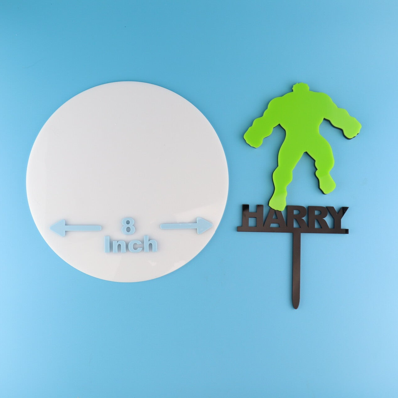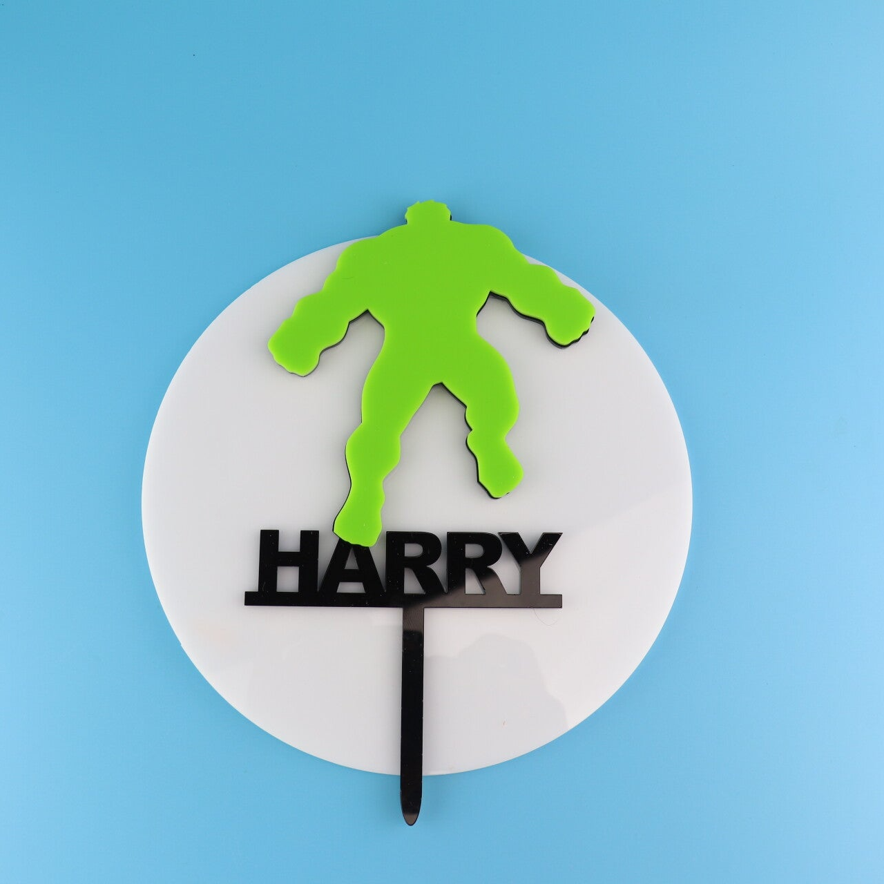 Crafted from top-quality acrylic, this impressive topper features a acrylic back plate with a personalised name proudly displayed at the bottom, topped with an eye-catching muscular superhero silhouette that instantly elevates any cake.