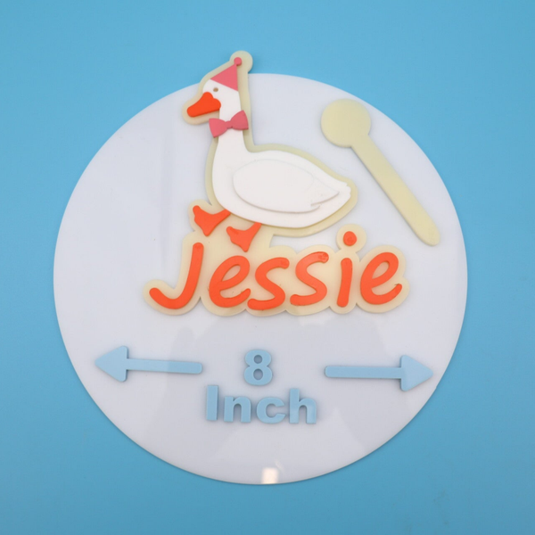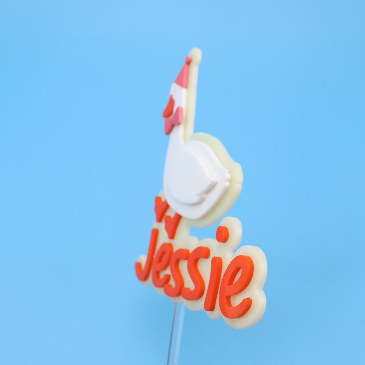 This playful design features a smartly dressed goose wearing a hat and bow tie ready for any party celebrations, finished with a personalised name underneath. Crafted from high-quality acrylic, the topper is double layered to create a bold, sturdy 3D effect that stands out beautifully on any cake. supplied with our unique Self adhesive cake prong you can choose to have it as a cake prom by simply attaching the prong to the back of the acrylic back plate or leave it off and use as a charm