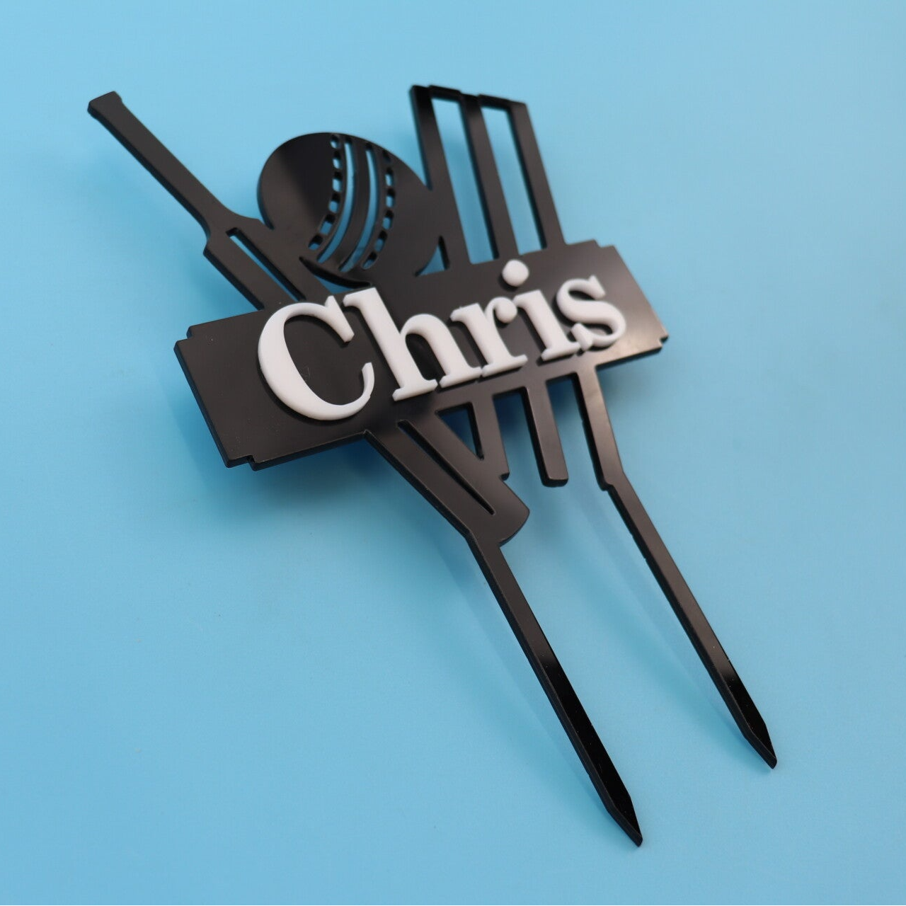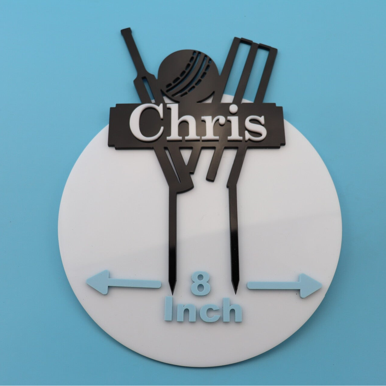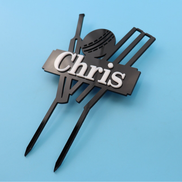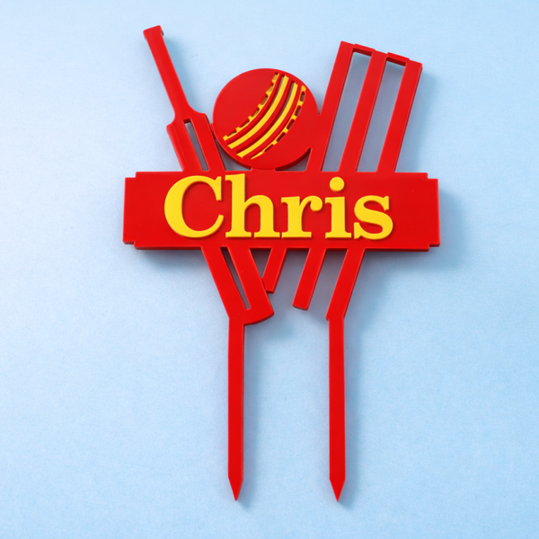 Crafted from top quality acrylic and precision cut for a flawless finish, this striking cricket-themed topper features a detailed cricket bat, ball and wickets design, complete with a personalised nameplate across the centre.